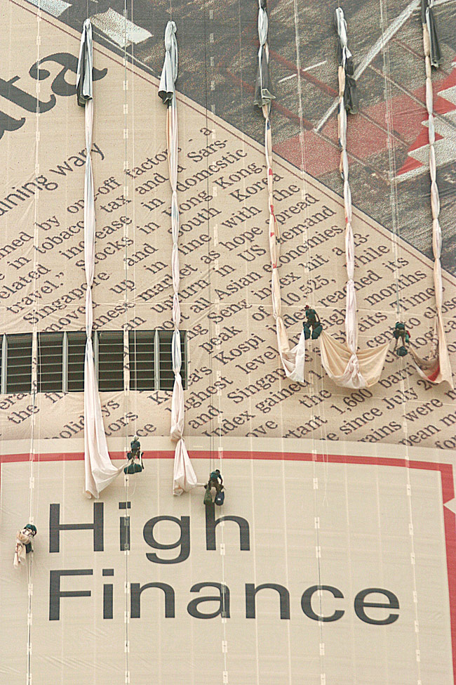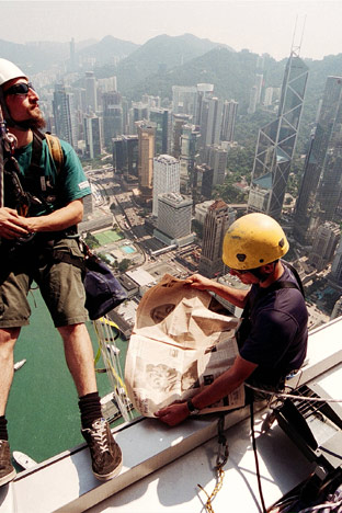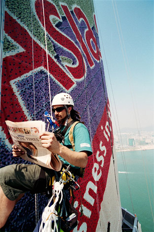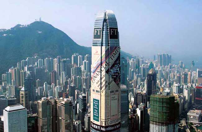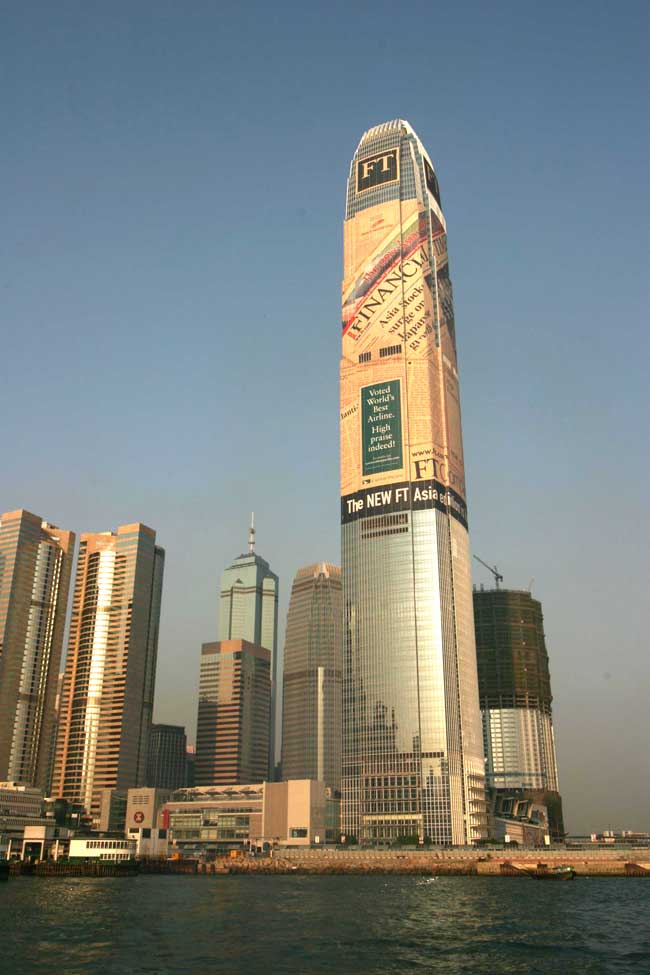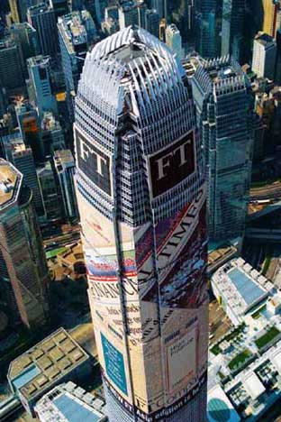 This unique project saw Two IFC wrapped in the world's biggest newspaper to highlight Financial Times' recently launched Asian edition and, at the same time, raise the profile of Hong Kong's tallest skyscraper which had recently been completed. The building wrap was the first of its kind seen in Hong Kong and used 20,000 square metres of mesh-style fabric. The wrap at a height of 400 metres covered 50 floors of the Two IFC building on the North and East sides and was taller than all but a handful of Europe's highest skyscrapers. The wrap took almost two weeks to print and 12 days to erect. At the time, it was the second largest billboard in the world at that time.