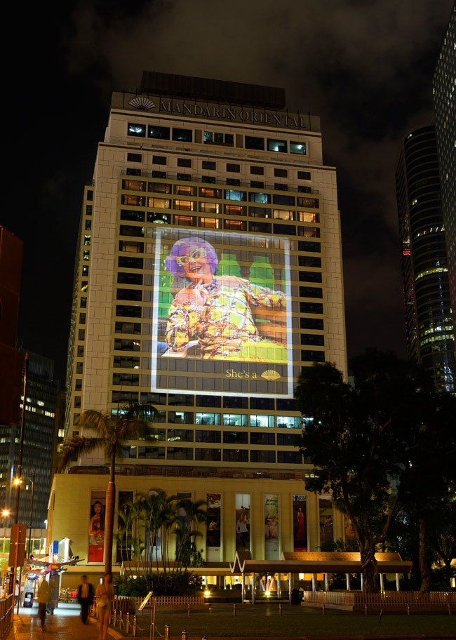Since 2000, the Mandarin Oriental has been running a consistent and long-term global advertising campaign based on top-notch celebrities endorsing the brand. The campaign has featured people like Vivienne Tam, Lance Armstrong, Michelle Yeoh, Frederick Forsyth, Vanessa Mae, Dame Edna Everage and I. M. Pei among others. When it came to re-launch Hong Kong's Mandarin Hotel after extensive refurbishment, MegaPrint's was involved in creating a huge projection of some of the brand's most memorable print ads onto the hotel building with spectacular results.