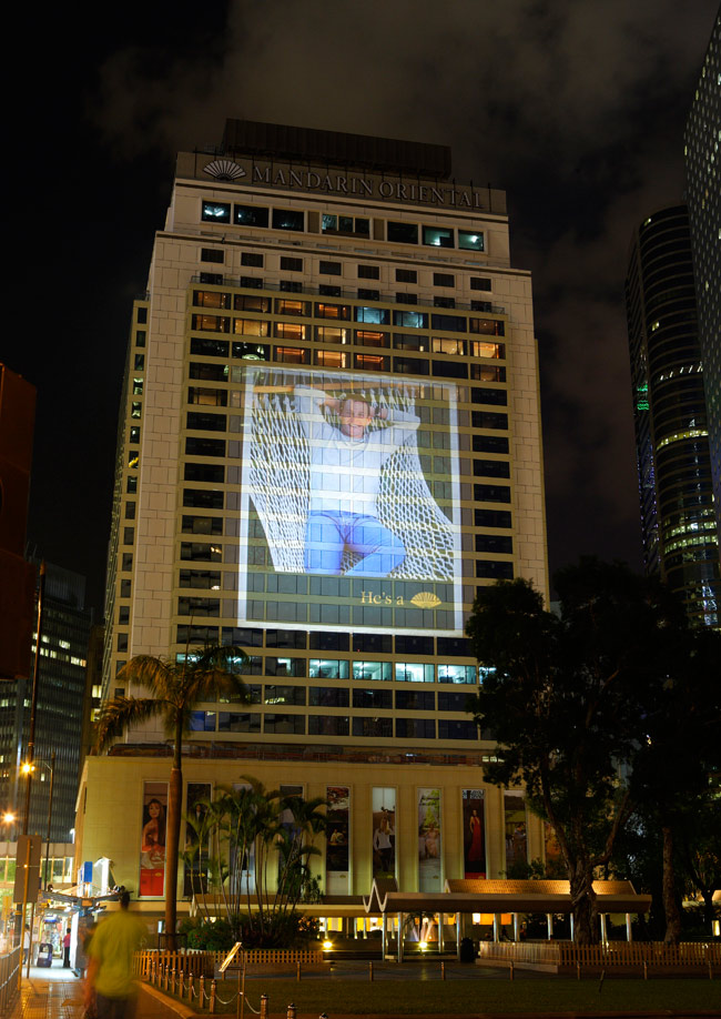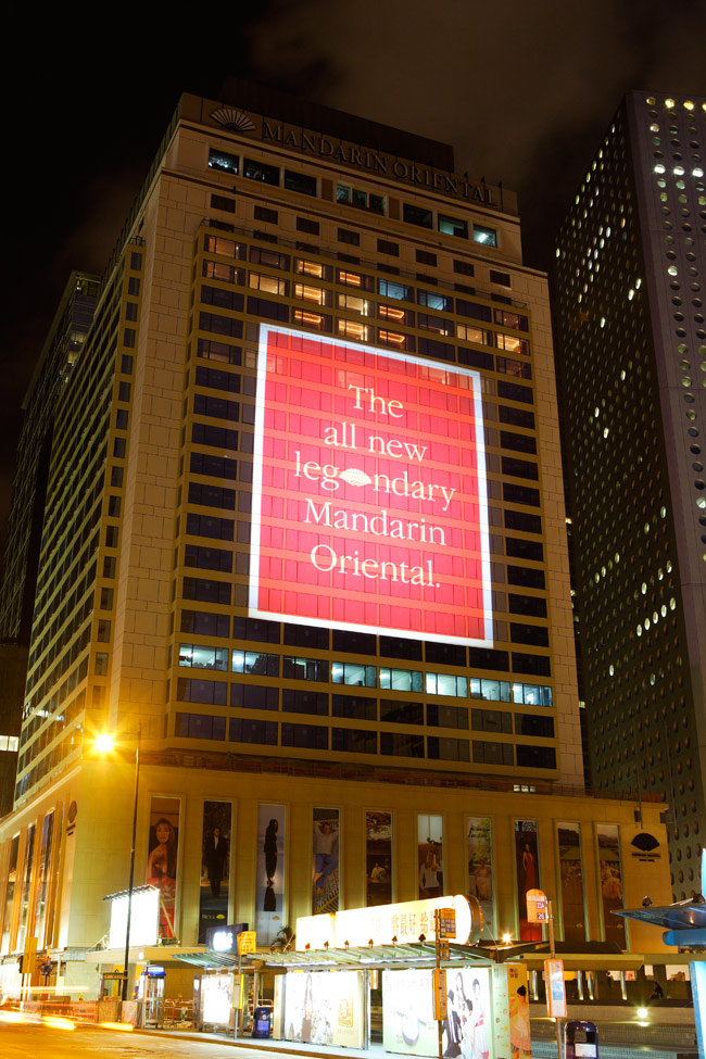 Since 2000, the Mandarin Oriental has been running a consistent and long-term global advertising campaign based on top-notch celebrities endorsing the brand. The campaign has featured people like Vivienne Tam, Lance Armstrong, Michelle Yeoh, Frederick Forsyth, Vanessa Mae, Dame Edna Everage and I. M. Pei among others. When it came to re-launch Hong Kong's Mandarin Hotel after extensive refurbishment, MegaPrint's was involved in creating a huge projection of some of the brand's most memorable print ads onto the hotel building with spectacular results.
